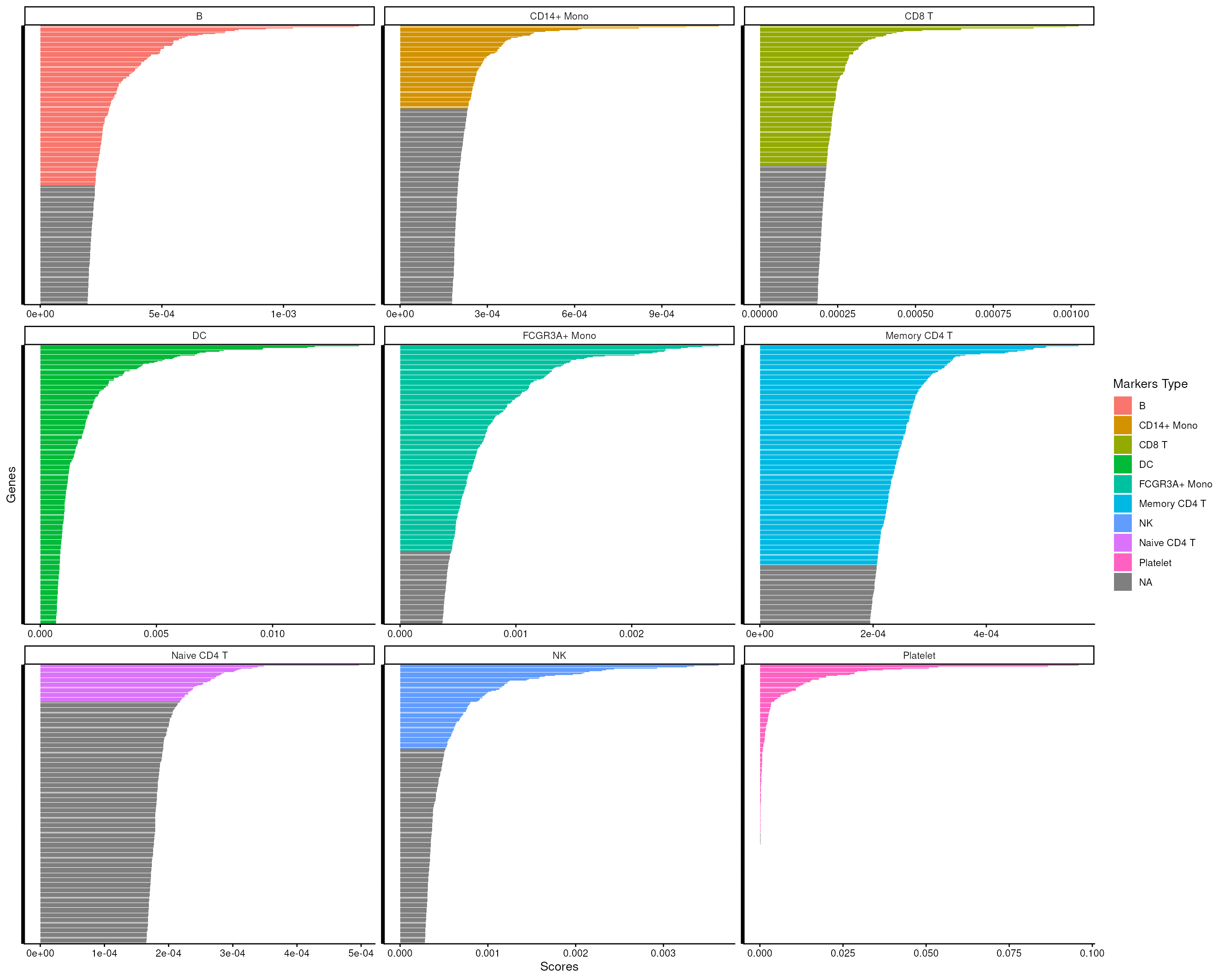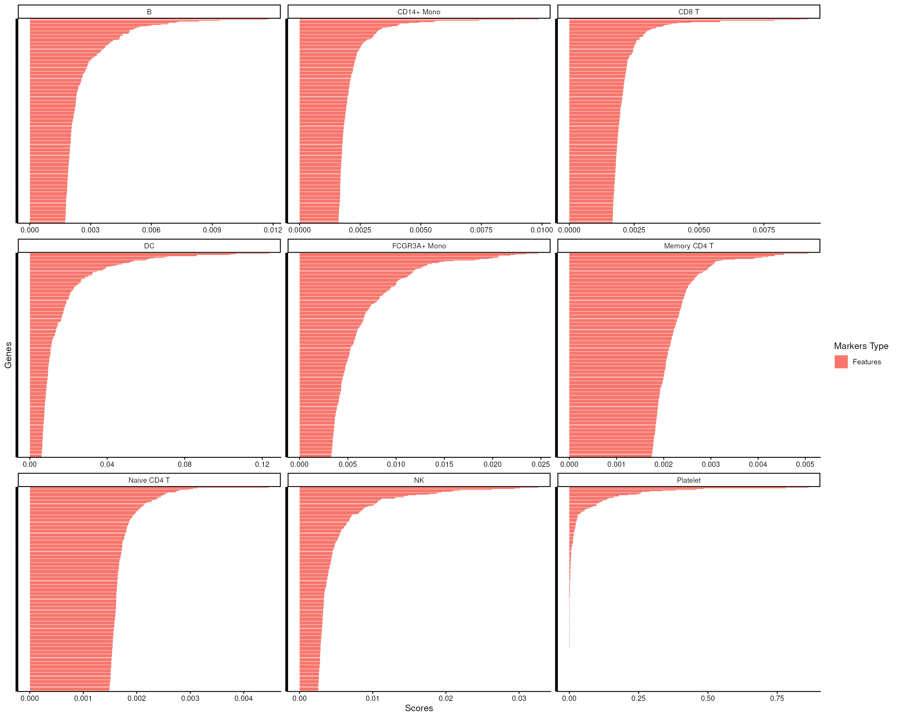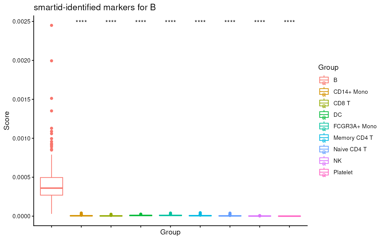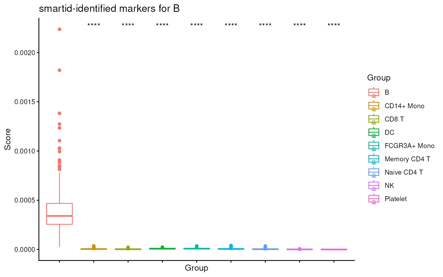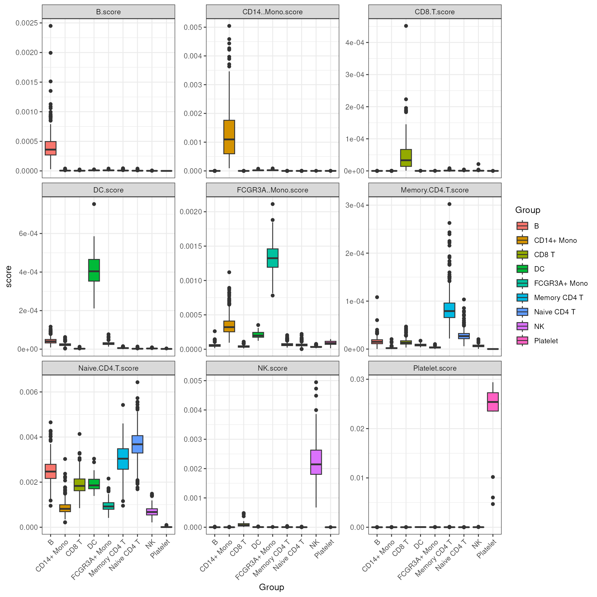 #> [16] "NK.score" "Naive CD4 T.score" "Platelet.score"We can then visualize all the scores across all cell types, see how well it can distinguish the target cell type from all others.